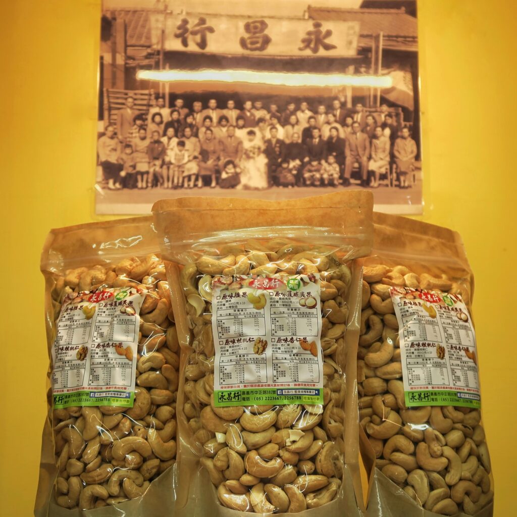 永昌行不只賣原料,也將選出來的好料,加工成方便嘉義人入口的商品,成分單純、少量鮮做,用自己的紅薏仁做爆紅薏仁、用自己的印尼腰果烤成大四喜